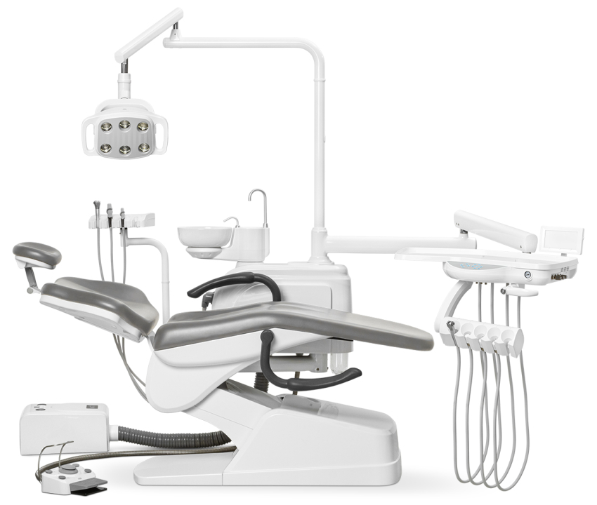 • Врачебный модуль имеет пантограф с пневмотормозом. Блок управления креслом и плевательницей. Четыре выхода М4 и водовоздушный спрей.